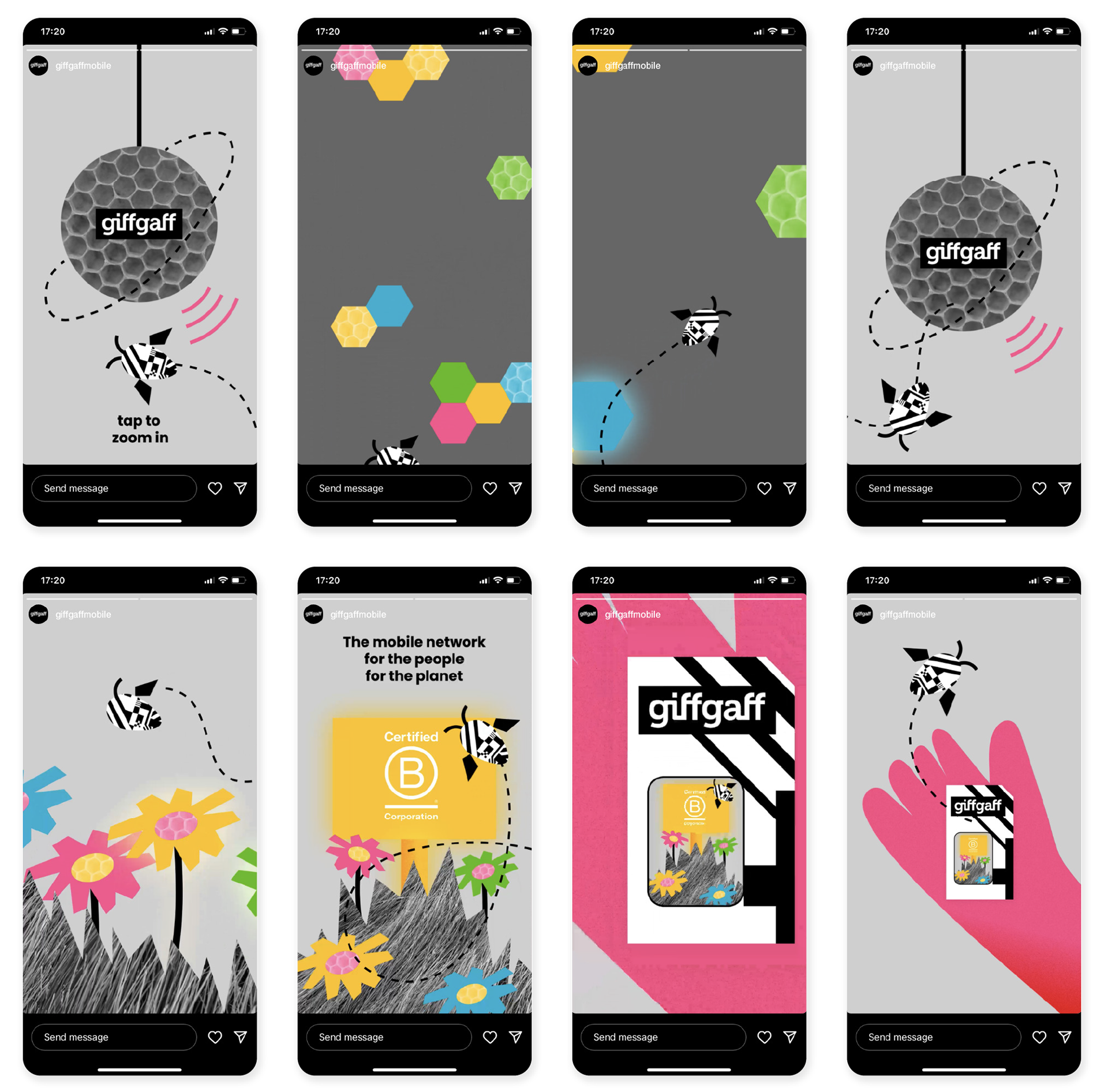 This is a D&AD submission that tells the story of giffgaff becoming a B Corp. A B Corp certification values the positive impact of a company. Using a B(ee) that collects nectar from flowers and spreads pollen,